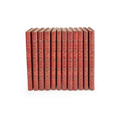 Paris: Barrie Frères, [n.d.] Comédie Française edition on Japan vellum, number 180 of 250 copies, 12 volumes, 4to, illustrations by Louis and Maurice Leloir, Jacques Leman and Edmond Hedouin, including 28 hand-coloured plates and numerous others, red morocco gilt, spines banded with decorative floral motifs, covers panelled with central "RLS" cipher to upper covers, red morocco gilt doublures over red silk endpapers, bookplates of Lucy Burwell Alan Fowlkes, some slight rubbing and minor chipping to edges and spine ends, a few joints very tender