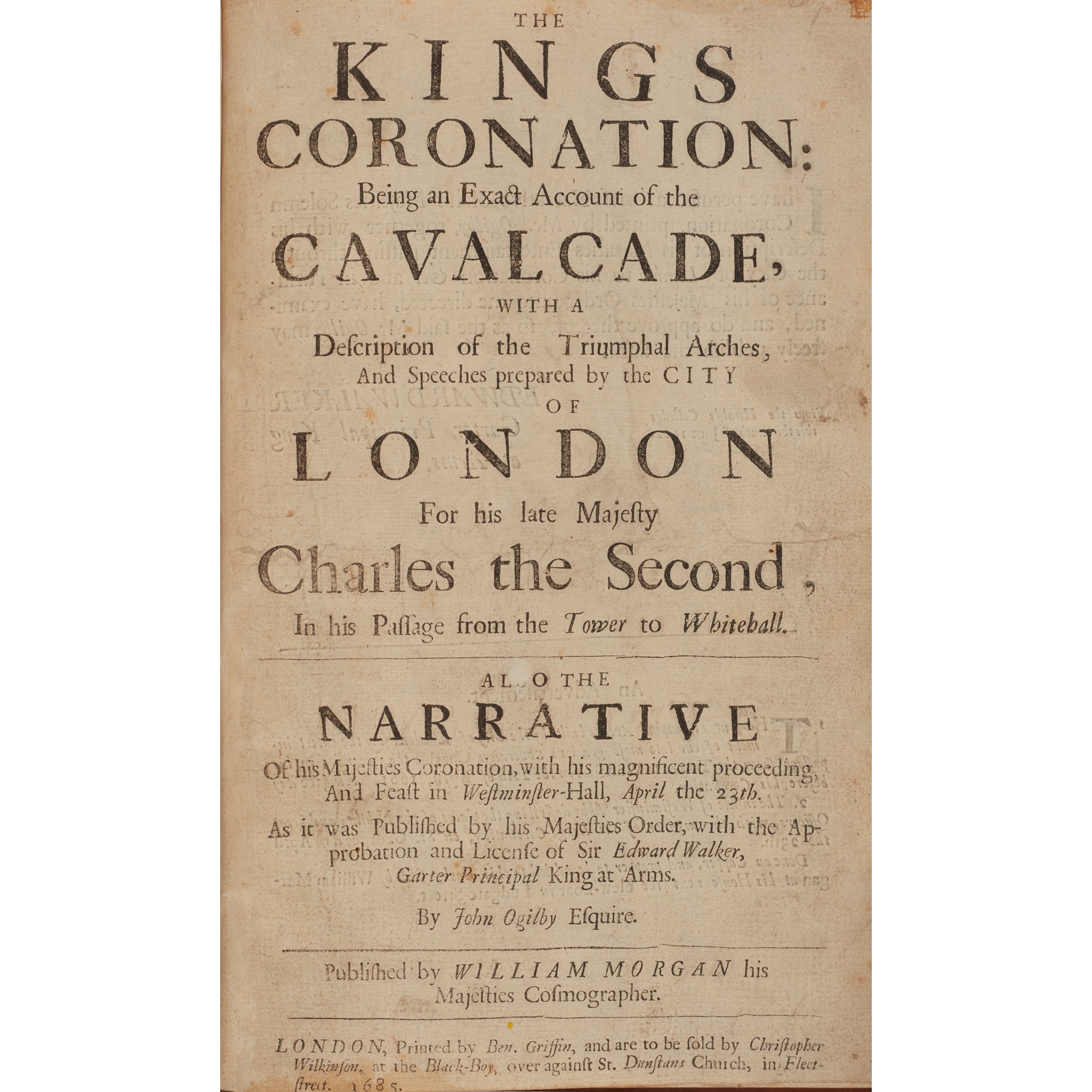 The Kings Coronation: Being an Exact Account of the Cavalcade, with a Description of the Triumphal Arches and Speeches prepared by the City of London for his late Majesty Charles the Second, in his Passage from the Tower to Whitehall. Also the Narrative of his Majesties Coronation, with his magnificent proceeding and Feast in Westminster-Hall, April the 23th... published by William Morgan his Majesties Cosmographer. London: Printed by Ben. Griffin, to be sold by Christopher Wilkinson, 1685. Folio, [ii], 18, modern calf with gilt lozenge to covers, lettered in gilt on spine, g.e., letter 's' of 'Also', on title page worn, lacks the license leaf at end, very small scrape to lower board; [ESTC R4915]