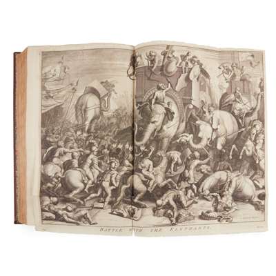 Note: First Duncan edition. William Duncan (1717-1760) was professor of philosopher at Marischal College, Aberdeen. The plates, many by Cornelis Huyberts, include depictions of Picts, Britons, and 'Germans', battles including the famous 'Battle with the Elephants' scene, military formations and encampments, aerial city views, and a suite of nine plates after Mantegna's Triumphs of Caesar. Remaining in print well into the 19th century, Duncan's translation was influential the 18th-century revival of interest in Britain's Celtic past and helped inspire his pupil James Macpherson in his creation of Ossian, the mythical Scottish bard. Publishing the work a few years after 1745 Jacobite rebellion, Duncan was evidently concerned to present Caesar as a model of leadership, advising his dedicatee the future George III: 'It is likewise well known, that in dangerous domestic seditions ... nothing tends more to confirm the well-affected in their duty, and to check the machinations of the factious, than when a king every was qualified to command, appears in person at the head of his troops'.
