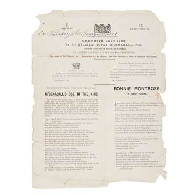 Note: Very rare broadside containing two poems by the infamous Scottish poetaster, dated July 1902, a few months before his death, in September. No other copies traced in libraries or in commerce.