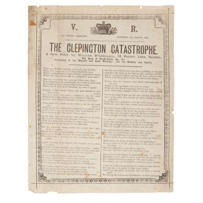 Note: Very rare early broadside poem by the infamous Scottish poetaster, published while he was still resident in his native Dundee, before he fled first to Perth and then Edinburgh to escape 'relentless persecution by local audiences' (ODNB). No other copies traced in libraries or in commerce.