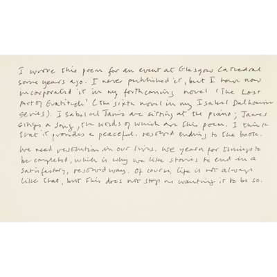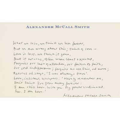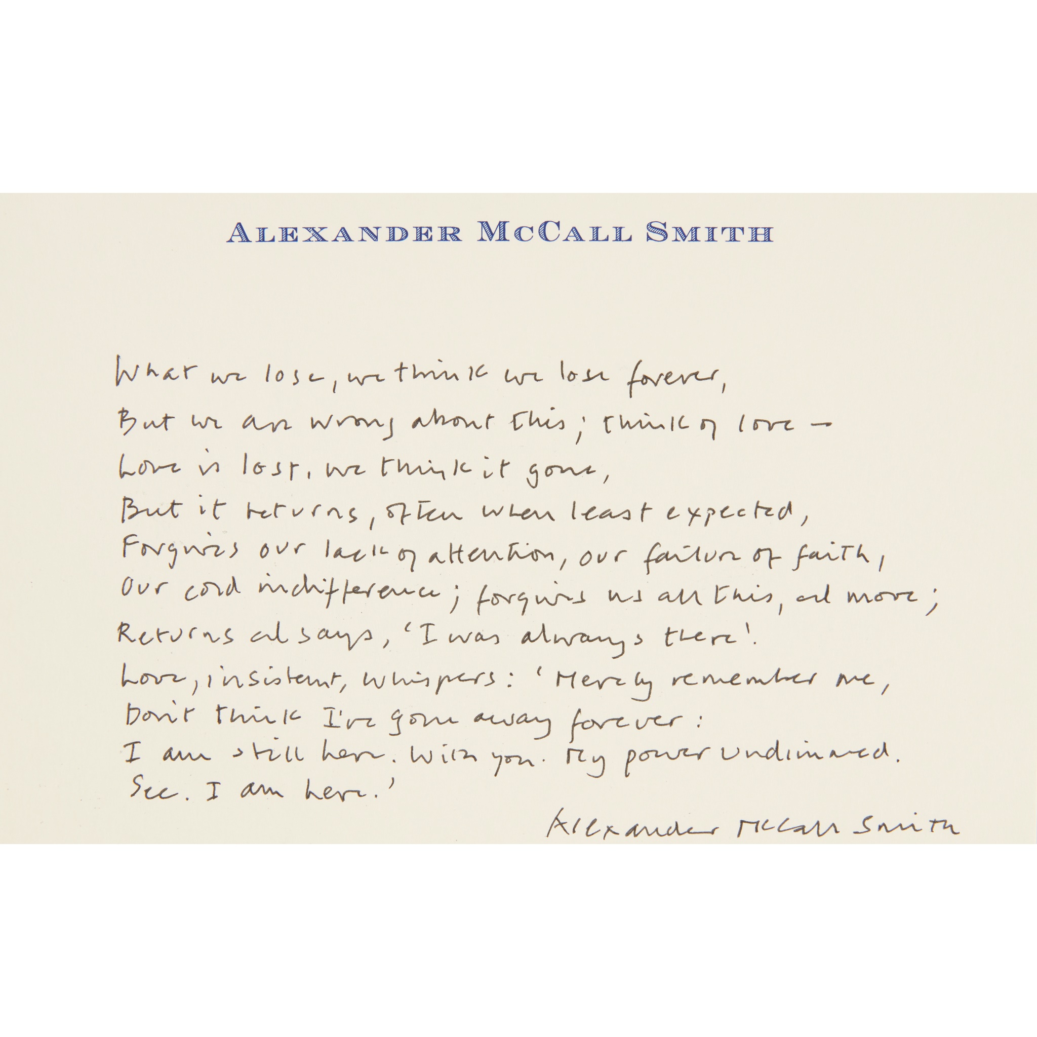 Poem on Love. "What we lose, we think we lose forever..." 11 lines, signed by the author, on cream card printed at head 'Alexander McCall Smith', in cream envelope