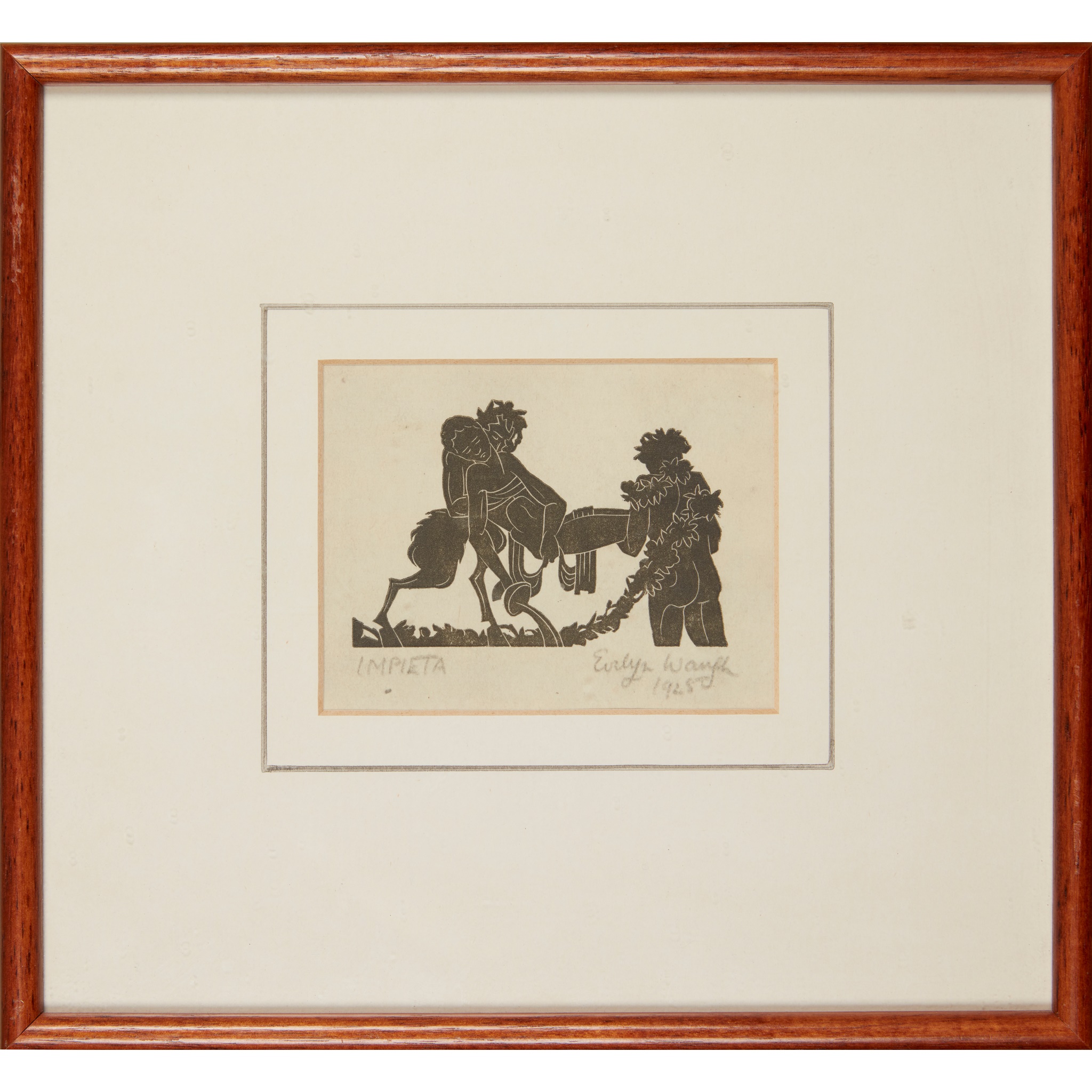 woodcut, showing a bacchante carried by Bacchus and a faun, signed and dated by Waugh lower right, title lower right, both in pencil, mounted, framed and glazed, mount aperture 8 x 10.5cm