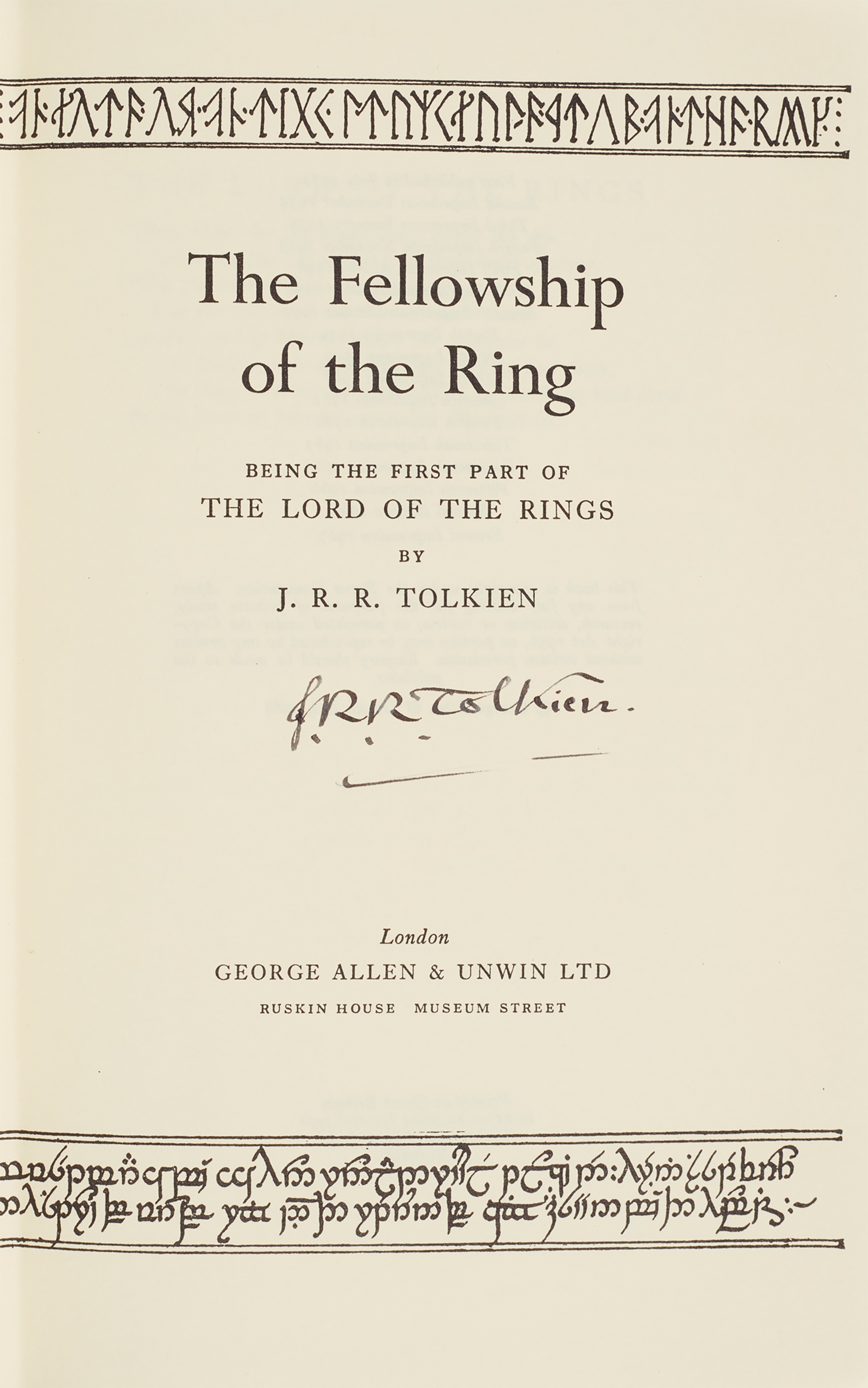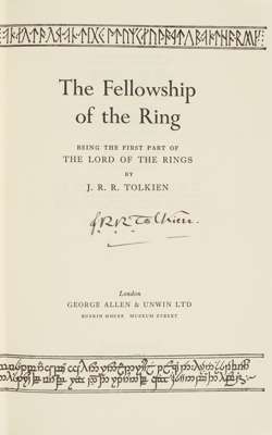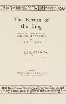 Note: With J. R. R. Tolkien's autograph signature to the title-page of each volume. The Fellowship of the Ring is a second edition, second impression (cf. Hammond A5 e. i); The Two Towers and The Return of the King are first editions, eleventh impressions. The dust jackets are all those of the second edition. The trilogy was first published in 1954-5 and the second edition, for which the text of each volume was partly reset and revised, was published in 1966.