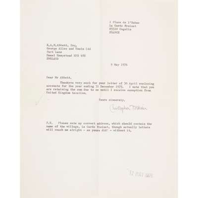 Provenance: Signed by Tolkien for K. A. M. Abbott, royalties accountant at George Allen & Unwin; thence by descent. The lot sold with a copy of The Silmarillion (1977), first edition, first impression, signed by Christopher Tolkien, and with a typed letter signed from Christopher Tolkien to Abbott.