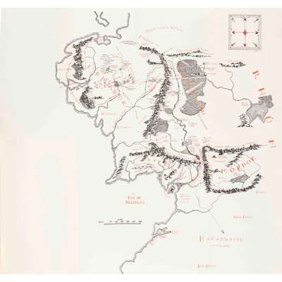 The Fellowship of the Ring; The Two Towers; The Return of the King. London: George Allen & Unwin, 1967-65-65. Mixed editions, 3 volumes, 8vo, original red cloth, with second edition dust jackets (in grey, with 'Revised Edition' on front panels and 'Second Edition' on front flaps), 3 folding maps in red and black, top edges dyed red. Some wear, chipping and soiling to dust jackets, light spotting to edges of textblocks