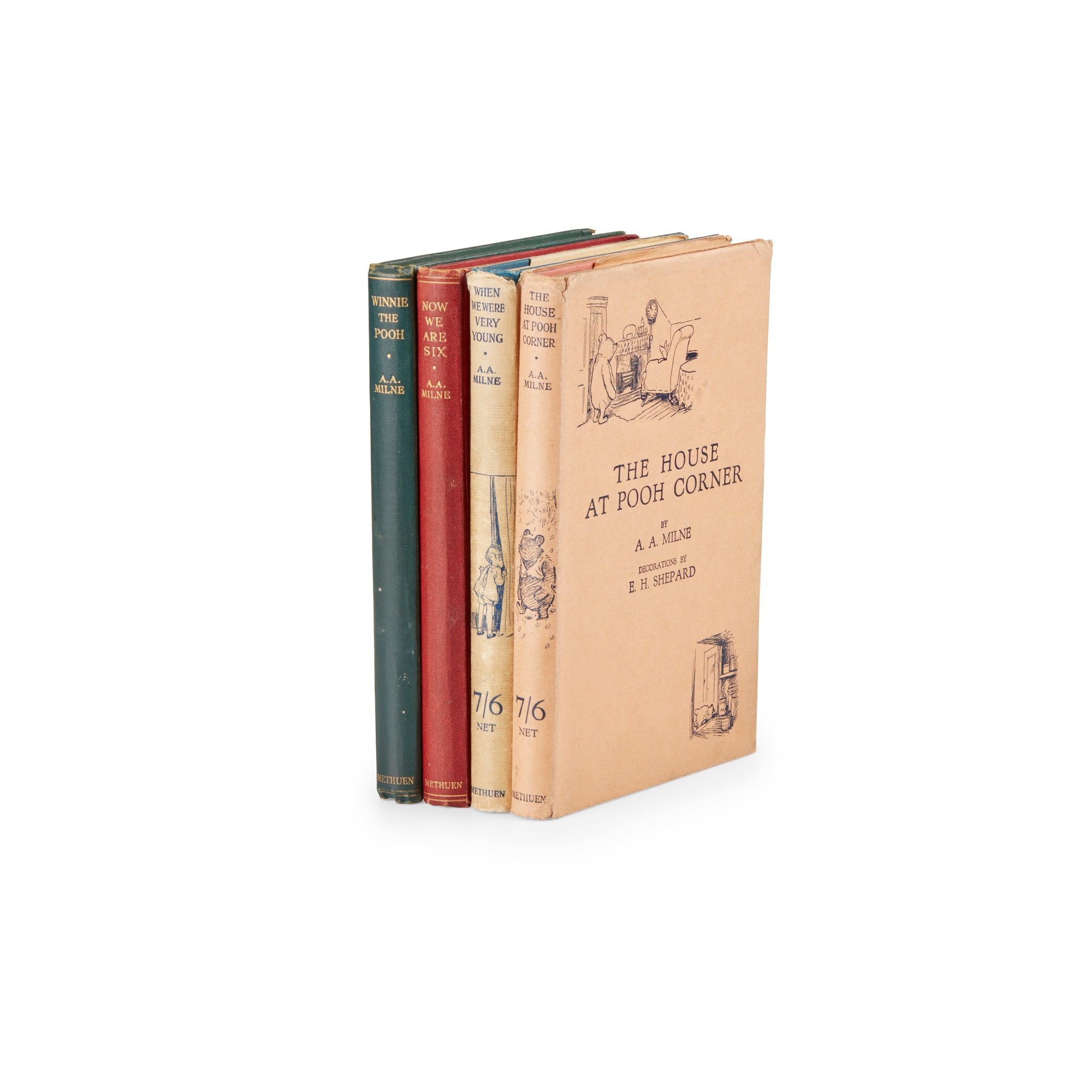 When We Were Very Young; Winnie-the-Pooh; Now We Are Six; The House at Pooh Corner. London: Methuen & Co. Ltd., 1927-26-27-28. 4 works, 8vo, original varicoloured pictorial cloth gilt, top edges gilt, pictorial endpapers and illustrations throughout the text all by E. H. Shepard, WWWVY and THAPC with the dust jackets, WWWVY spine rolled, dust jacket slightly dust-soiled and with fraying to head of spine, WTP spine slightly rolled, light rubbing to extremities, a few faint scuffs and small marks to rear board, customary browning to endpapers, closed tear in pp. 77/8, a few small marks to margins of text, NWAS with light rubbing to extremities, a few internal blemishes and marks, THAPC dust jacket with slight softening and loss to spine-ends, short close tear to foot of rear panel, a few faint marks, covers marked, upper fore corner of front cover bumped, customary browning to free endpapers, inner hinges slightly tender, pp. 5/6 with closed tear in gutter, a few leaves dog-eared, a few other blemishes and marks