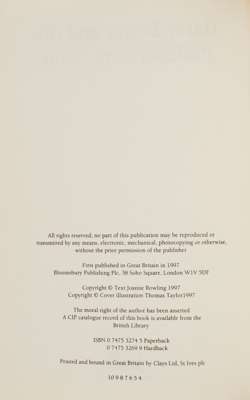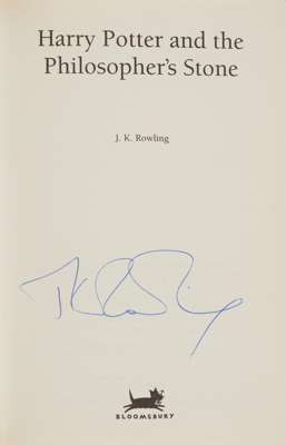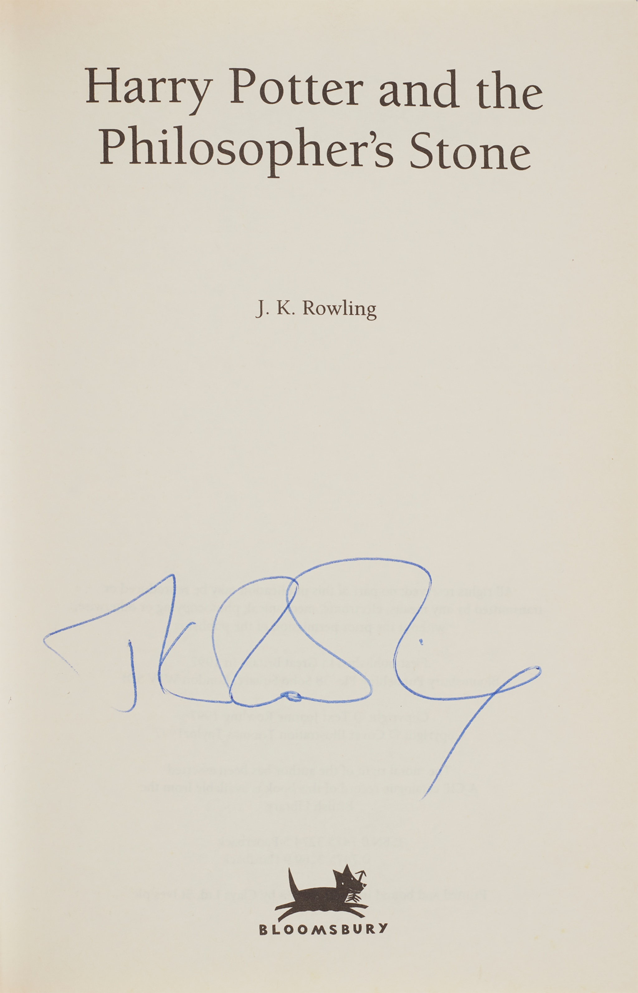 London: Bloomsbury, 1997. First edition, fourth impression (numberline reading 10 9 8 7 6 5 4), signed by J.K. Rowling on title-page, 8vo, original illustrated boards, dust-jacket not price-clipped, sellotape repair to p.147 with no loss to text, dust-jacket with some edgewear and a little chipping to spine ends, dust-jacket spine slightly faded, neat child's ownership signature to front free-endpaper