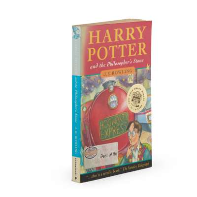 London: Bloomsbury, 1997. First edition, twentieth impression (numberline reading '20' on title verso), paperback issue, inscribed by the author 'to Adam, with best wishes, J K Rowling' on the dedication page in black ink, 8vo, original pictorial wrappers with Smarties Gold Award Winner label to upper cover, spine sunned, self-adhesive bookseller's label (James Thin, Edinburgh) to front cover, textblock toned as usual