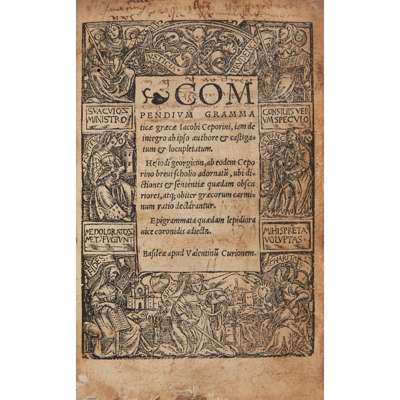 Ceporinus, Jakob. Compendium grammaticae graecae, iam de integro ab ipso authore et castigatum et locupletatum. Hesiodi georgicon ... Epigrammata. Basel: Valentin Curio, 1522. First edition, 175 [1] pp, allegorical woodcut border to title-page, printer's woodcut device to verso of colophon leaf, text in Greek and Latin (Latin in italic types), early ink annotations including ownership inscription 'George Hudson is the right owner of this book', title-page dust-soiled and with shallow chipping to foot, variable tide-mark to foot of gutter, [VD16 ZV 15528; not in Adams, the earliest edition there listed being Zurich, 1539];