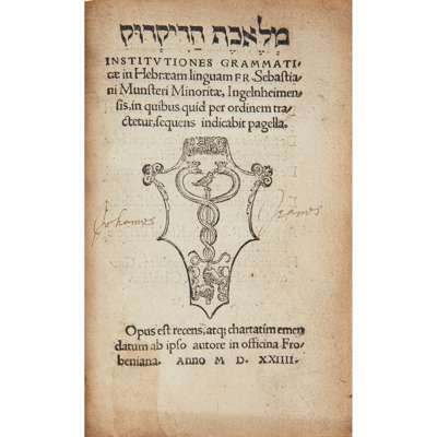 [Hebrew title at head: Melekheth ha-Diqduq]. [Basel]: Froben, 1524. First edition, [288 pp.], printer's woodcut device to title and final page, text in Hebrew, Latin (roman types) and Greek, musical notation in text, title-page dust-soiled and with early ownership inscription, old staining to a8 v. and b1 r., final page stained and with early ink annotations, a few marks and early ink annotations elsewhere [Adams M1932; VD16 M 6685].
