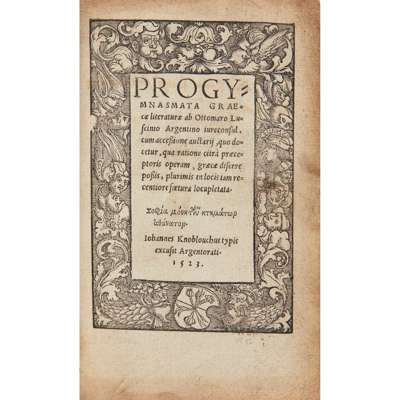 Luscinius, Ottmar. Progymnasmata graecae literaturae. Strassburg: Johannes Knobloch, 1523. [28] 87 [30] pp., woodcut border to title-page, printer's woodcut device to final page, ownership inscription 'Ego libro Joannis Harryse Scoti 12th Octobrii anno 1561' to verso of title-page, occasional early annotations and underlining, title-page dust-soiling, a few stains elsewhere [Adams L1731; VD16 N 32].