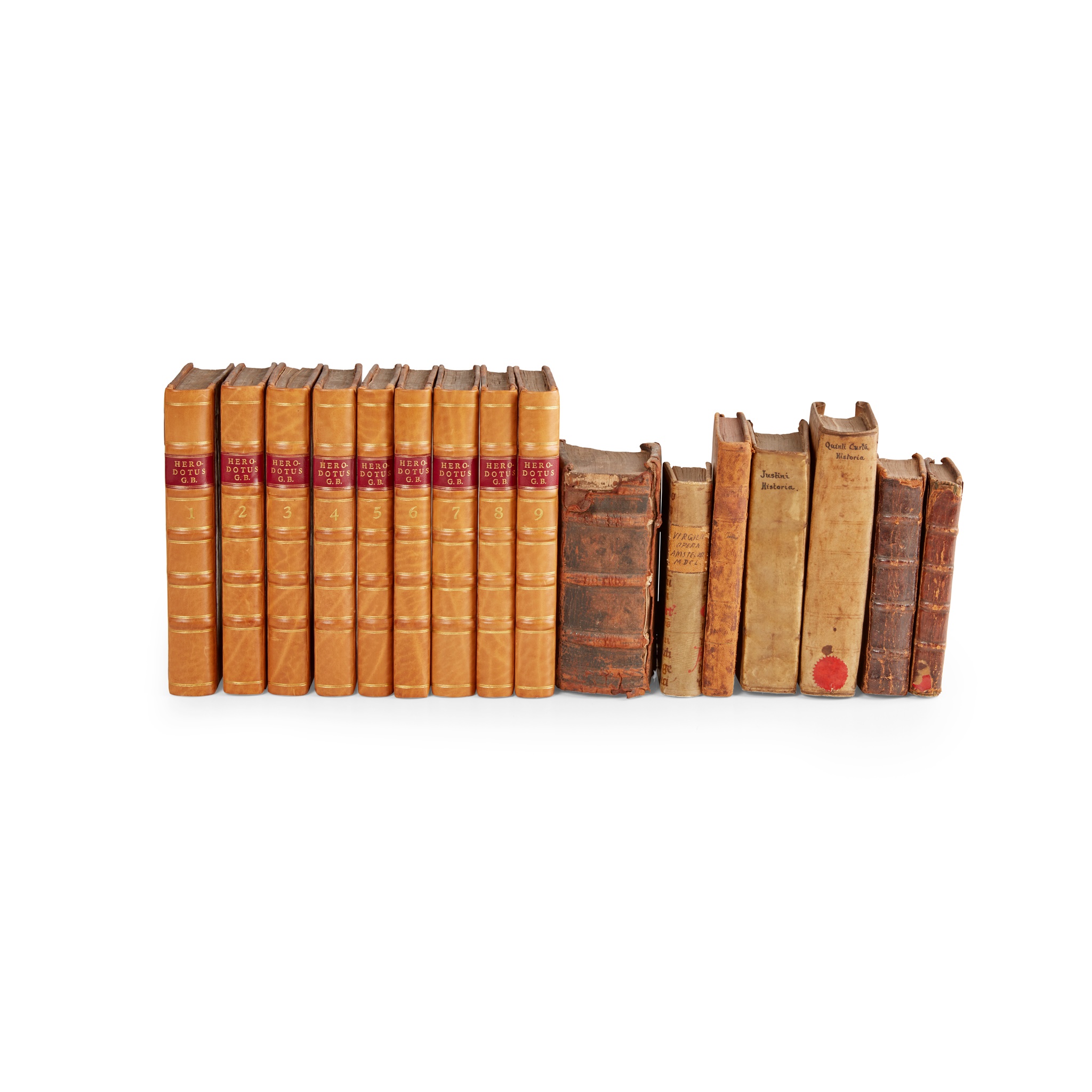 Herodotus. He Tou Herodotus Halikarnasseos Historia: Herodoti Halicarnassensis Historia, ex editione Jacobi Gronovii. Glasgow: R. and A. Foulis, 1761. 9 volumes, 12mo, Greek text, contemporary calf, neatly rebacked, red morocco lettering pieces, early inscription '? Rose Price' to free endpapers, small stamp 'E. Maltby' to free endpapers