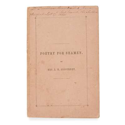 Note: First and only edition, presentation copy, inscribed 'Dr Demetrius Stamatiadis, from his friend, the author, Hartford, Sept 27th 1845' on the front cover; a total of 1,000 copies were printed, and apparently bought up by a local benefactor for free distribution to sailors (Haight, Mrs. Sigourney: The Sweet Singer of Hartford, 1930, p. 177). Sigourney was 'one of the first American women to succeed at a literary career' (Ency. Brit.). One other copy traced at auction (New York, 2006), restitched and lacking the half-title.