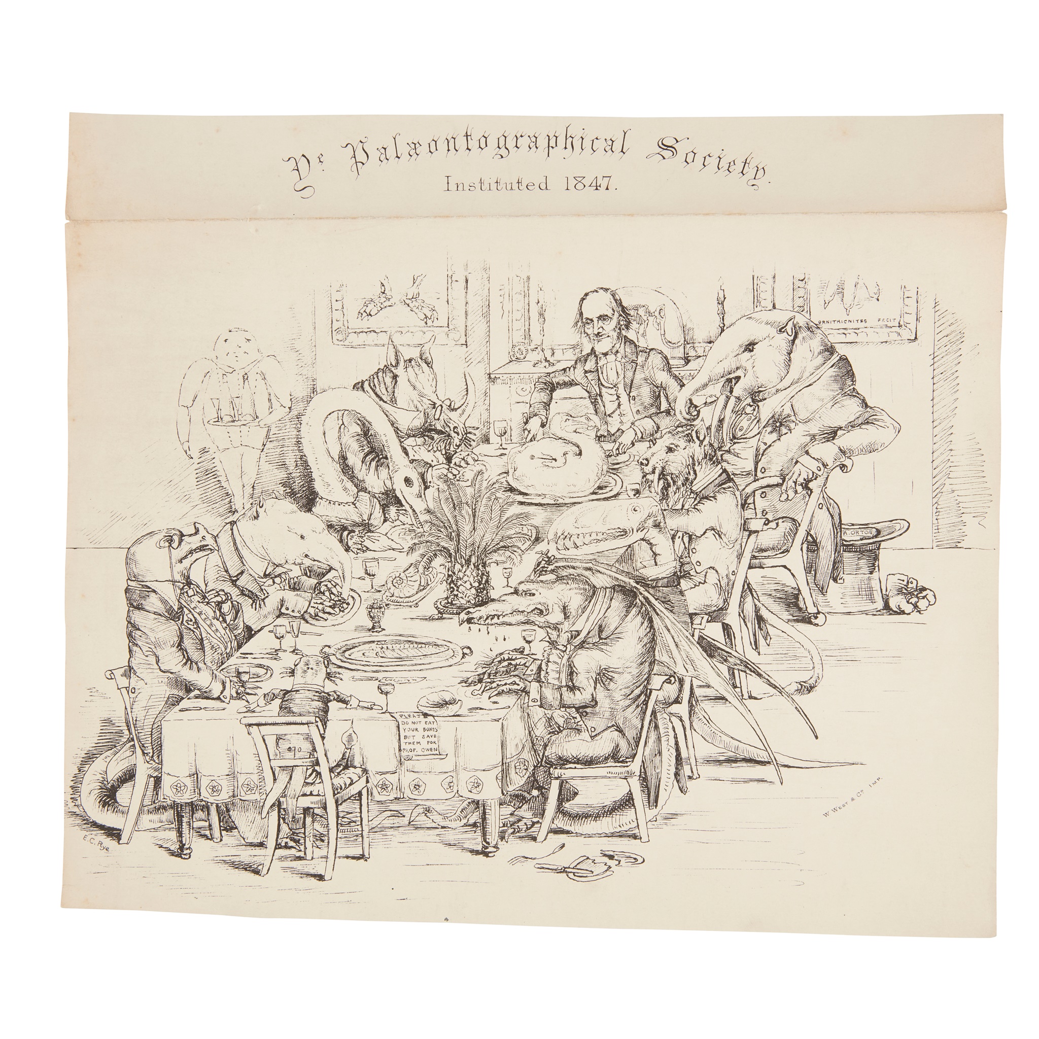 Anniversary Dinner Menu, 17th April 1874, with dishes named after famous palaeontologists, Richard Owen and Charles Darwin's names appearing, amongst many others, on the tree trunk, 39.5 x 26cm, lithographed, central fold; and a lithographed cartoon by E.C. Rye of a Palaeontographical Society dinner (presided over by Richard Owen), 22 x 25cm, one fold