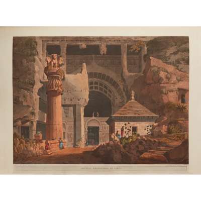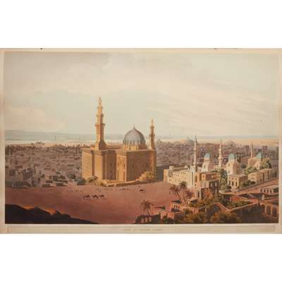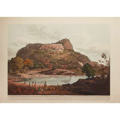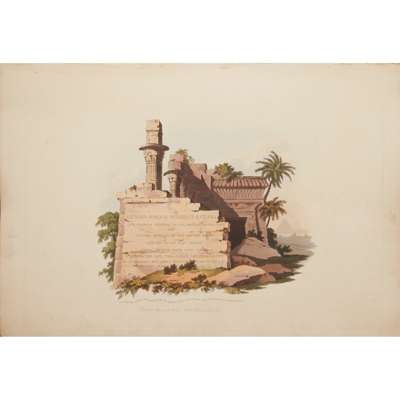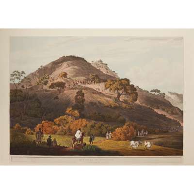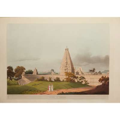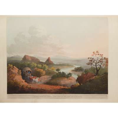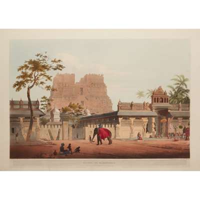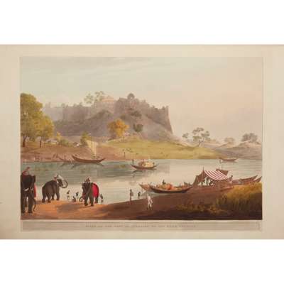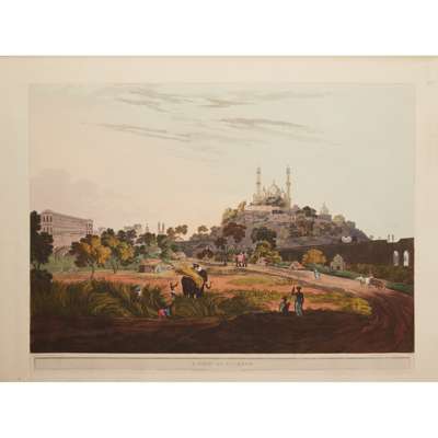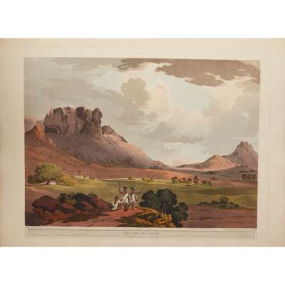 London: William Miller, 1809. Atlas folio (73 x 52cm), contemporary half russia, gilt black morocco label to front board, pictorial hand-coloured aquatint title-page, 22 hand-coloured aquatint plates (of 24: lacking 'Calcutta' and 'Poonah'), all on thick wove paper, J. Whatman Turkey Mill watermarks (all dated 1830 where visible, except 'A View near the Roode Sand Pass', 1834), contemporary protective paper guards bound in between plates. Lacking the title-page, bound without the text as usual (Tooley: 'The text is not important and the work is usually to be found without it'), leather on spine worn away with fragments laid in, front board near-detached, wear to corners, spotting to endpapers, front free endpaper torn, occasional light spotting, variable light finger-soiling to plate margins, no guard between title-page and 'Sandy Bay Valley' plate (bound before title-page) and both consequently slightly marked, 'Mosque at Lucknow' with spots above skyline, 'A View within the Fort of Monghyr', 'View of Grand Cairo' and 'Pagodas at Trinchicunum' each with a few spots or marks above skyline, 'Vale of Calaat' with superficial paper disruption along top edge of platemark [Abbey Travel 515; Tooley 440]