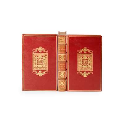 London: Longman, Brown, Green and Longmans, 1855-56. First edition, 3 volumes, 8vo, half-title in volume 3, errata leaf in volume 1, 8 tinted lithographed plates, 5 chromolithographed plates, 1 wood-engraved plate, 2 folding maps, and 2 plans (1 folding), fine red straight-grained morocco gilt with gilt device of Robert Tyndall Hamilton Bruce (1847-1899), spines gilt, by Zaehnsdorf, green silk endpapers with gilt device of R.T.H. Bruce, gilt edges, some light dampstaining to about 5 plates