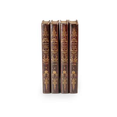 Voyage autour du monde. Troisième edition, ouvrage enrichi de soixante dessins coloriés, de Notes scientifiques, et des Portraits de MM. J. Arago et F. Arago. Paris: Gayet et Lebrun, 1840. Third edition, 4 volumes, 8vo, 2 uncoloured engraved portraits and 59 (of 60) hand-coloured lithographed plates, half-titles, contemporary maroon half morocco, spines gilt, a few plates browned or with some offsetting, sporadic spotting to text