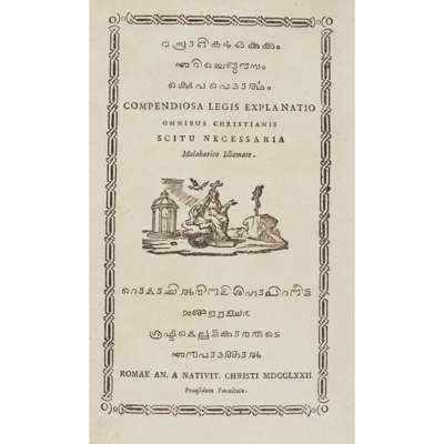 [Title in Malayalam at head:] Nasranikal okkakkum ariyentunna samksepavedarttham]. Rome: [no printer], 1772. 8vo, contemporary boards, signatures pi1 A-R8 S2, Malayalam types throughout (except for title-page, partly in Latin), wood-engraved vignette to title-page and first page of text, decorative borders throughout