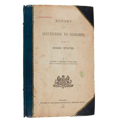 Note: First edition, specified 'confidential' on the title-page, perhaps one of 100 copies according to the printer's slug on the final page, no other copy traced in libraries or in commerce (such records as do exist appearing to pertain to a 1991 facsimile reprint published by the government of Meghalaya's directorate of arts and culture). In Khasi culture, eligibility to hold the office of siem (ruler) is passed down by matrilineal descent, though the office-holder is male. The power of the siem is not absolute, with authority dispersed among various ministers, clan chiefs, elders and other figures, and in the case of Khyrim state a high priestess (ka siem-sad).