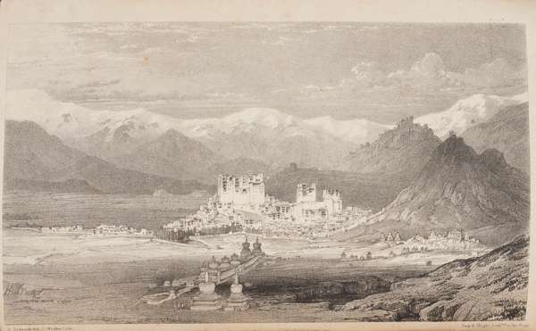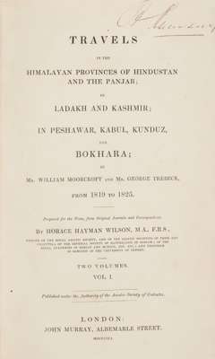 in Ladakh and Kashmir; in Peshawar, Kabul, Kunduz, and Bokhara. Prepared for the Press, from Original Journals and Correspondence, by Horace Hayman Wilson. London: John Murray, 1841. First edition, 2 volumes, 8vo (20.3 x 12.5cm), near-contemporary black half sheep, lithographic frontispieces, folding map, 12 pp. advertisements, contemporary ownership inscription to title-pages, volume 1 lacking leaf a8 (preface pp. xv/xvi), marginal repair to foot of p. liii, folding map with splits and repairs;