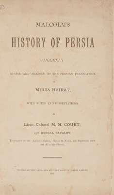 Malcolm, John. Malcolm's History of Persia (Modern) edited and adapted to the Persian Translation of Mirza Hairat, with Notes and Dissertations by Lieut.-Colonel M. H. Court, 15th Bengal Cavalry. Lahore: printed at the "Civil and Military Gazette" Press, Lahore, 1888. Folio (32.5 x 20cm), modern half leather, [2] ix [3] 290, title-page slightly nicked and marked and with small annotation to upper inner corner, light marginal soiling elsewhere, last 2 leaves slightly nicked and with damp-staining to corners;