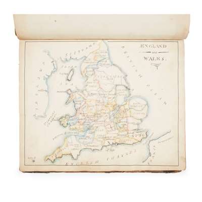 “With outline maps of all the counties”, 1817. Compiled at Mrs Keeble’s School, Camberwell, comprising a manuscript title-page, 99 manuscript pages of description and 43 hand-drawn and coloured maps of English counties (and North and South Wales), 23 x 18.5cm, contemporary green half morocco, a little dust soiling and occasional spotting in places