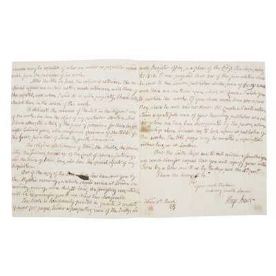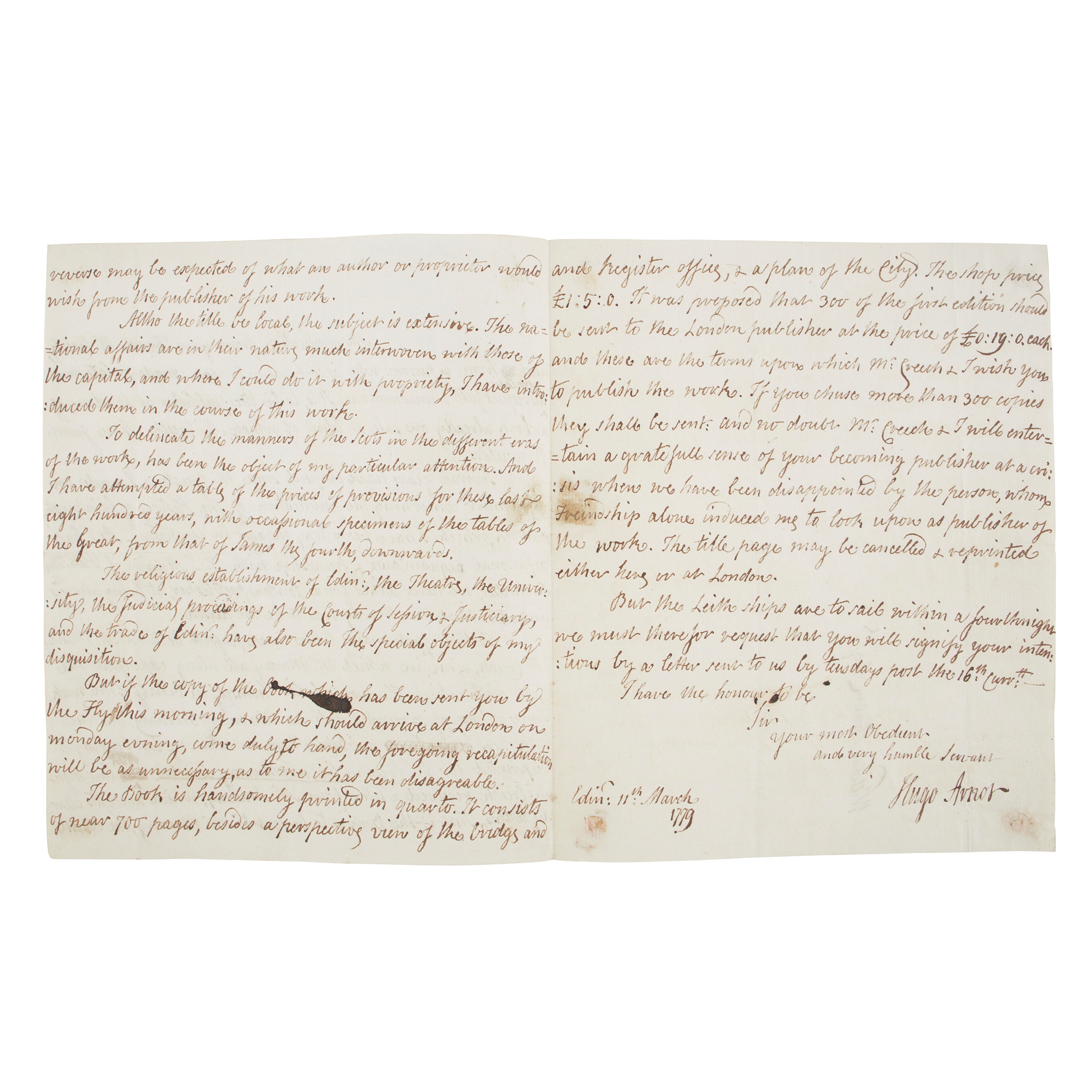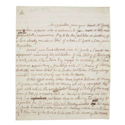 to William Strahan, on the 11th March 1779, regarding the printing and publication of a London edition of Arnot's The History of Edinburgh, Arnot writes: "Several years have elapsed since Mr Creech & I made an agreement concerning the publication of The History of Edinburgh, a work, which I have been long engaged in composing. As I had a personal acquaintance & friendship with Mr. J. Murray of Fleet Street, Bookseller, we never looked for a London publisher, it being always understood that Mr. Murray was to be the person...the book was to be published here on Saturday last, bearing to be printed for W. Creech Edin., & T. Murray London. But last night Mr. Creech received a letter from Mr. Murray, which amounts clearly to this,, That if the Book is to be sent to Mr. Murray, the reverse may be expected of what an author or proprietor would wish from the publisher of his work...It was proposed that 300 of the first edition should be sent to the London publisher at the price of £0:19:0. each and these are the terms upon which Mr. Creech and I wish you to publish the work...Mr. Creech and I will entertain a grateful sense of your becoming publisher at a crisis when we have been disappointed...The title page may be cancelled & reprinted either here or in London." 3 manuscript pp., 22 x 18cm