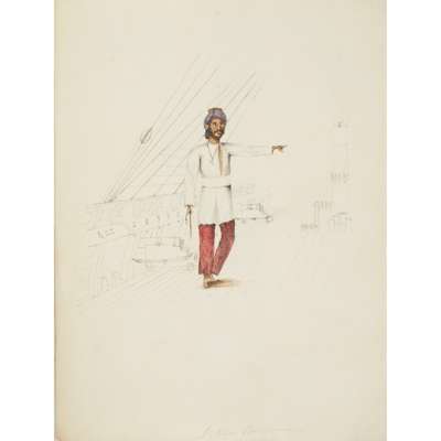 4to, contemporary marbled boards, rebacked, 266 pp. (pagination irregular but no leaves apparently excised; many pages left blank), on wove paper watermarked 1833, with numerous full-page sketches in pencil and/or watercolour, including some 10 views of coastlines and ships (of which 3 in watercolour), many captioned with details of subject, coordinates and date ('E. I. Ship Protector, T. Buttenshaw, Commander, outward bound. Thursday April 6th 1837'; 'Island of Trinidada bearing W by S. 1/2 S, sketched April 6th 37 by J. Longden ...'; 'St Antonio one of the Cape Verd Isles ...'; 'The Protector coming to an anchor at Rankafullah Pagoda in the river Hooghly Sept 8th 37'), a pencil sketch of a busy harbour against a mountainous backdrop (possibly Hong Kong), 10 anatomical studies, 5 studies of animals, fruit and plants (including a coloured sketch of flowers from Mauritius, lychees, and a walrus, etc.), and several others including various preparatory or unfinished sketches, the text including a lengthy verse account of the voyage to ('bound to Bengal and China', see p. 266; headed 'The Departure' and 'The Passage Out', written in rhyming couplets), medical notes on diseases including cholera and scurvy, including an account of an emergency on ship ('When in Calcutta ... I had some singular cases one which ran thus: Mr Clark a stout florid healthy man a Scotchman by birth was attacked one day at 1P.M. while in the heat ... with ... rigid spasms'), notes on fellow crew members ('To Captn Buttenshaw I am greatly indebted not only for giving me my berth without a moments hesitation or asking to see even a certificate of qualification but also for his great kindness to me during my illness in Calcutta'; 'Mr Brooks held the double situation of 3rd mate and sailmaker, he was a man who had risen from before the mast and had been nearly all over the world a first rate seaman ... he spoke French and Spanish and a little Italian and Bengali', etc.), poems addressed to family members (variously signed 'off the coast of Sumatra', 'Bay of Bengal', and 'Diamond Harbour, River Ganges'), an extensive section titled 'Chemical Notes from a Course of Study under Professor Everitt', and quotations from classical authors
