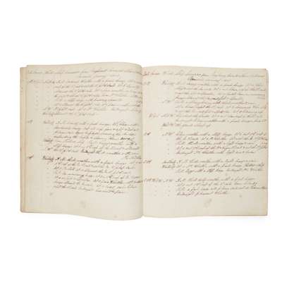 4to (28 x 23cm), contemporary red half sheep, approx. 65 pp., in ink on feint-ruled wove paper, possibly a fair copy, kept by one John Gould, including logs of voyages to and from New Orleans in 1852 in the 'Sumroo', and to San Francisco in the 'Anne Cheshyre' in 1853, logs of work towing or transporting ships arriving at Liverpool docks from New York, Canada, Calcutta, New Orleans, etc., and similar notes, loss to spine;