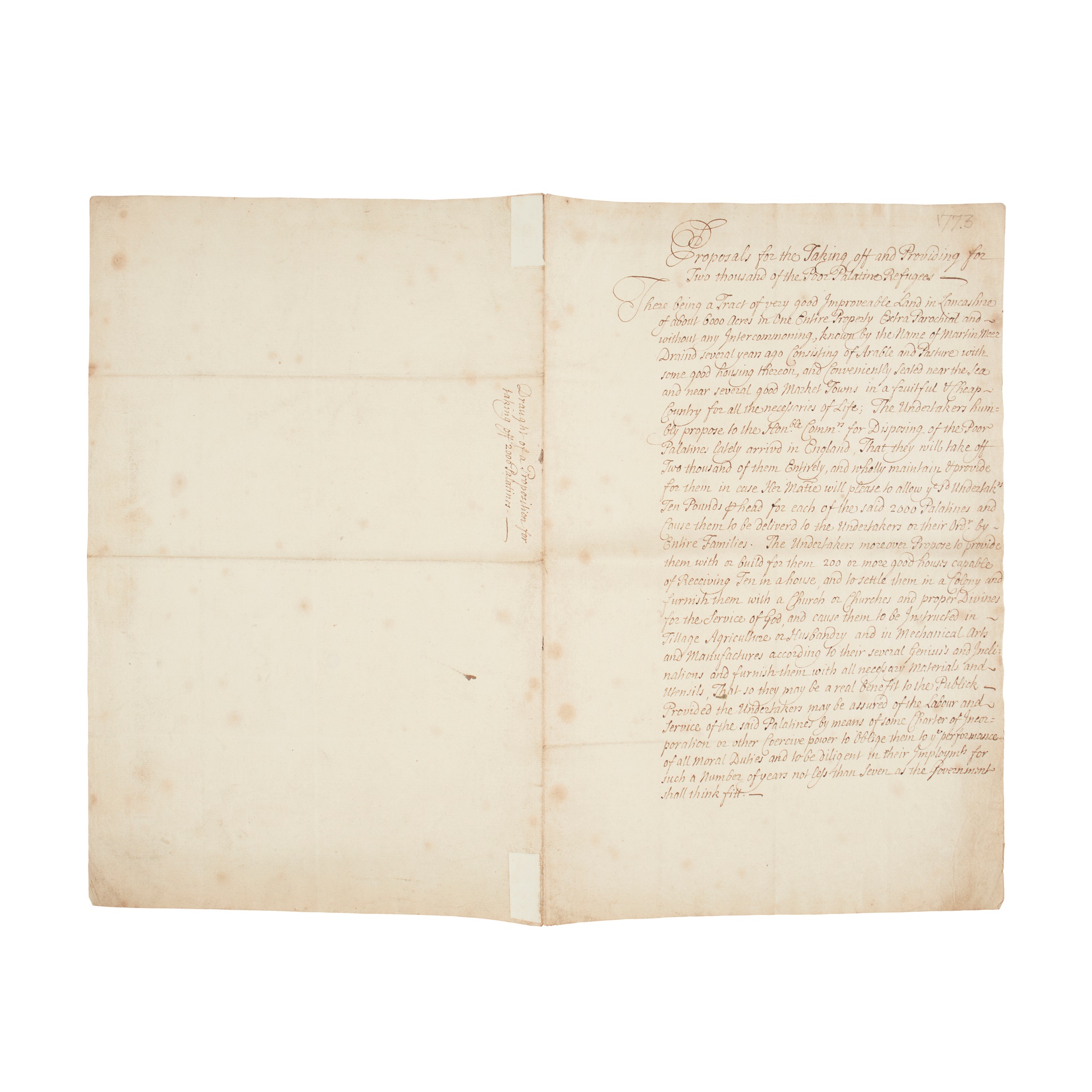 Draft manuscript in 30 lines: "There being a tract of very good improveable Land in Lancashire of about 6000 Acres in One Entire Property Extra Parochial...in a fruitful and cheap Country for all the necessaries of Life; The Undertakers humbly propose to the Honble. Commrs. for Disposing of the Poor Palatine lately arrived in England, That they will take off Two thousand of them Entirely, and wholly maintain and provide for them...", bifolium leaf 30 x 19cm, the date 1773 added later in pencil to the upper right corner, with two small purple Tudor rose stamps, possibly a copy of an earlier document
