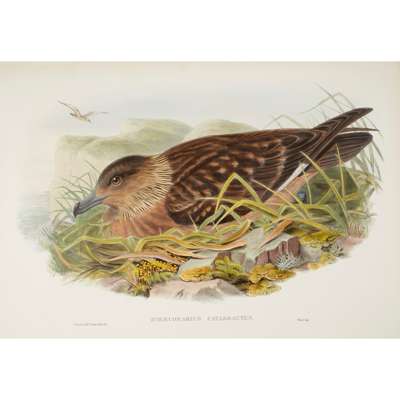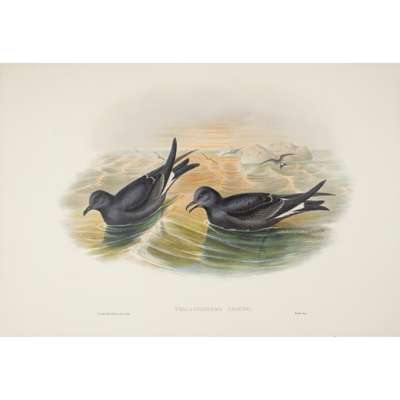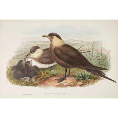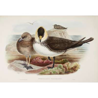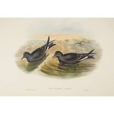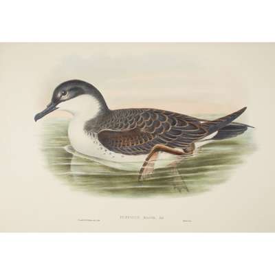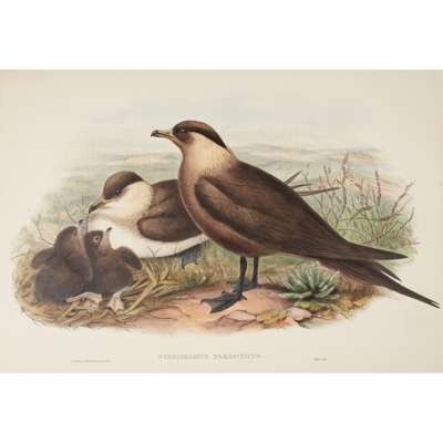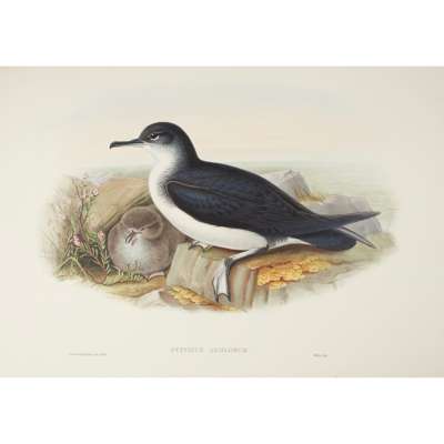 1) Alca torda (razorbill); 2 & 3) Uria troile (common guillemot), 2 copies; 4 & 5) Uria grylle (black guillemot), 2 copies; 6) Mergulus alle (little auk); 7) Thalassidroma leachii (fork-tailed storm petrel); 8 & 9) Thalassidroma pelagica (storm petrel), 2 copies, one slightly soiled around edges; 10 & 11) Phalacrocorax carbo (great cormorant), 2 copies; 12) Phalacrocorax graculus (spectacled cormorant); 13 & 14) Rissa Tridactyla (black-legged kittiwake), 2 copies; 15) Stercorarius longicaudus (long-tailed skua); 16 & 17) Stercorarius parasiticus (arctic skua), 2 copies, one with show-through from text; 18) Stercorarius caractes (pomarine skua); 19) Stercorarius pomatorhinus (pomatorhine skua); 20) Procellaria glacialis (northern fulmar); 21 & 22) Puffinus anglorum (Manx shearwater), 2 copies; 22) Puffinus major (great shearwater)