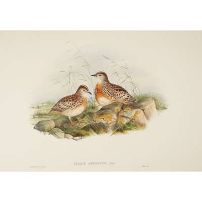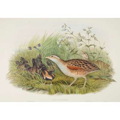 1) Tetrao tetrix (black grouse); 2) Palumbus torquatus (wood pigeon); 3) Columba livia (rock dove), short closed tear in right-hand margin; 4) Certhia famillaris (treecreeper); 5) Cypsellus apus (swift); 6) Corvus monedula (jackdaw); 7) Turnix africanus (Andalusian turnix), closed tears in left-hand margin; 8) Otis tetrax (little bustard), finger-soiling to lower left-hand corner; 9) Rallus aquaticus (water rail), jagged bottom edge where disbound, slightly spotted; 10) Crex pratensis (corn crake), jagged bottom edge where disbound, a few spots