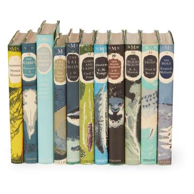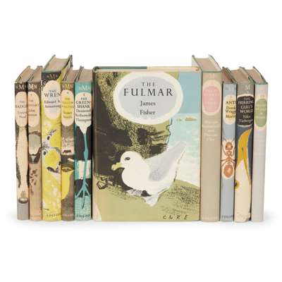 Numbers 1-10 and 12-22 (without The Heron, number 11). London: Collins, 1948-71. First editions, 21 volumes, 8vo, original green cloth, with the dust jackets (none price-clipped), fading to cloth of Redstart, Yellow Wagtail and Trout, a few spines slightly rolled, variable light spotting to dust jackets (chiefly to flaps and rear panels) and occasionally to edges of textblocks, Fleas, Flukes & Cuckoos jacket slightly faded along spine and head of jacket front panel Herring Gull's World jacket with two repaired closed tears to front panel, Birds of the London Area jacket similarly faded and with short closed tear to head of front panel [Bernhard & Loe M1A-10A & 12A-22A]