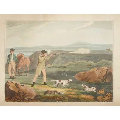 Thornhill, R. B. The Shooting Directory. London: for Longman, Hurst, Rees, and Orme, 1804. First edition, first issue (retaining 2E4-2F2, i.e. pp. 215-220), 4to, contemporary half calf rebacked, 7 hand-coloured aquatint plates, 1 engraved plate (of 2), 3 folding tables, half-title discarded, text spotted and browned, closed tear in 2Z2 [Schwerdt II pp. 258-9];