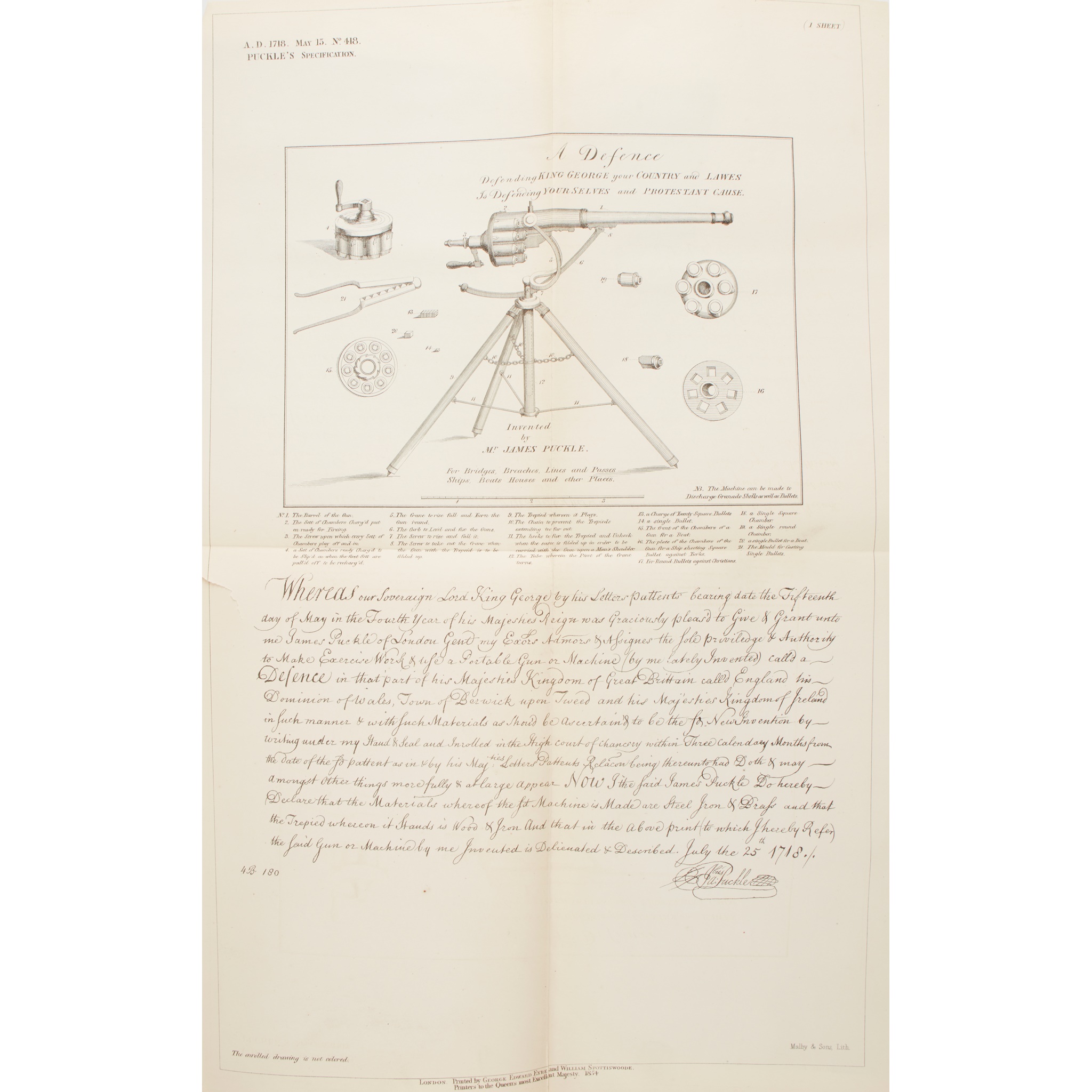 [volumes 1-4:] enrolled under the Act 21 James I. From 15th May 1718 to 10th September 1852 [volume 5:] filed under the Act 15 & 16 Vict. c.183. From 1st October 1852 to 31st December 1853. London: George Edward Eyre and William Spottiswoode, 1854. 5 volumes, folio (28.5 x 17.5cm), contemporary half morocco, spines lettered in gilt, marbled sides, edges untrimmed, each volume containing approximately 80 patents, separately paginated, each with royal arms to head and publisher's imprint at end, profusely illustrated with lithographic plates (most of them folding), title-page to each volume (except volume 4), volumes 1 and 5 with index at front, bindings rubbed, blind stamps (American Institute Library) to title-pages and endpapers, a few closed handling tears to folding plates