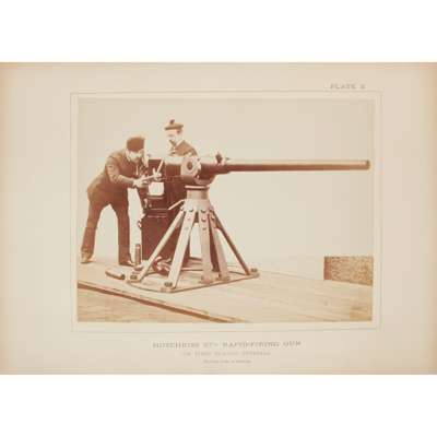 Hotchkiss & Co. The Hotchkiss Single-Barrel Rapid-Firing Gun. A Description of the System by Alfred Koerner. Paris: printed for private circulation, 1884. 4to, original cloth, 37 [3] pp., 11 plates, comprising 7 albumen print photographs (mounted as issued) and 4 folding lithographic diagrams, bookplate and ownership inscription of Henk Visser (1923-2006), noted collector of arms and armour, booklet 'Measurements and Weights of Hotchkiss Rapid-Firing Guns ...' laid in, Hotchkiss company ink-stamp to title-page, wear to spine-ends, front free endpaper detached, text-leaves and lithographic plates toned, folding plate 10 a touch proud and consequently nicked and rumpled along fore edge;
