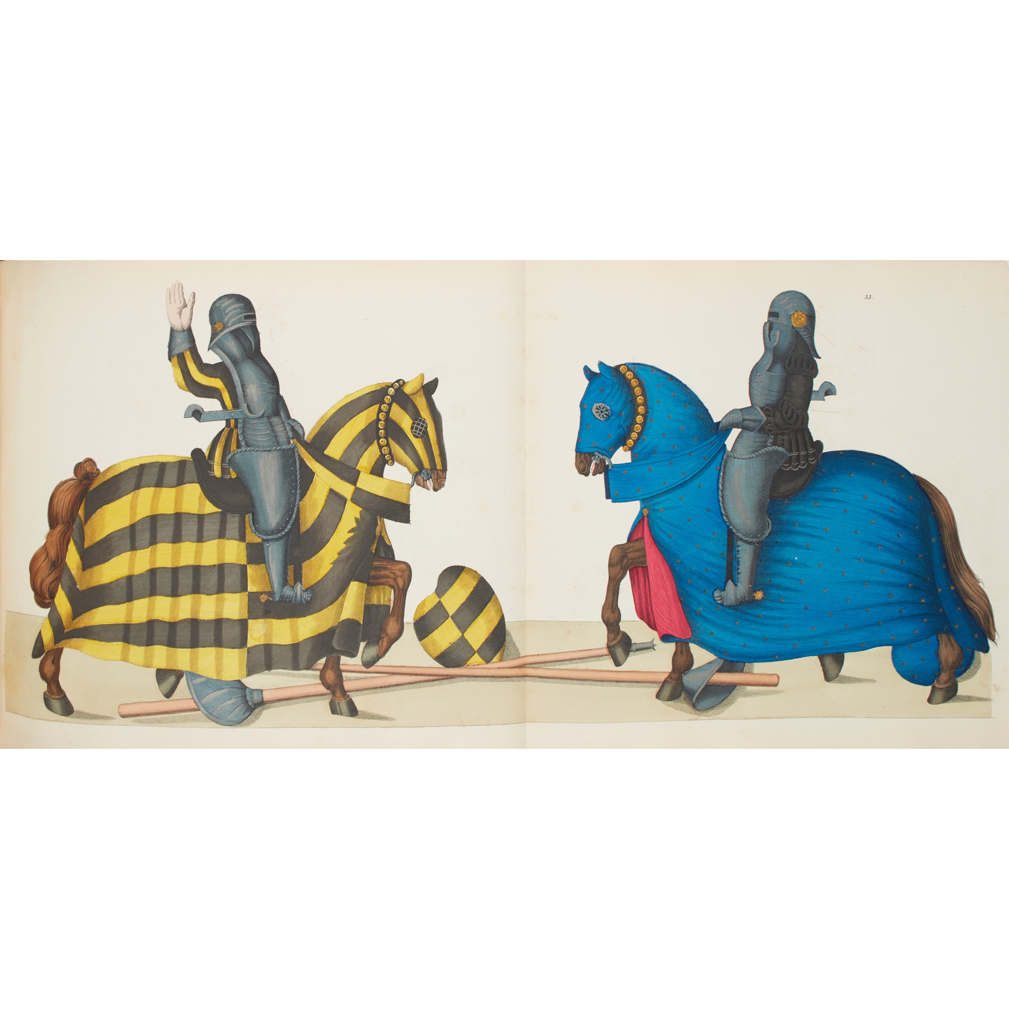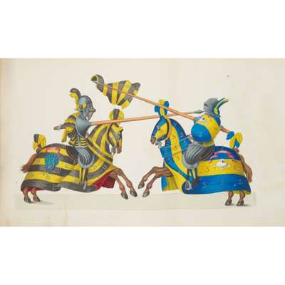 with Descriptions of the Feudal System, the Usages of Knighthood, the Tournament, and Trials by Single Combat, translated from the German by the Rev. A. Löwy. London: William & Sotheran, 1857. Oblong 4to, [8] pp., 110 columns, [4] pp., original blue cloth gilt, recased, 61 hand-coloured lithographic plates heightened with metallic pigments (of 62: lacking plate 5), of which 26 folding, variable spotting and offsetting, frontispiece nicked along bottom edge, plates 1 and 62 chipped along fore edges, plate 45 creased, damp-staining to rear endpapers and margin of plate 61