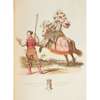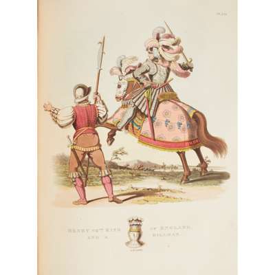 As it existed in Europe, but particularly in England, from the Norman Conquest to the Reign of King Charles II. [Together with:] Engraved Illustrations of Antient Arms and Armour, from the Collection of Llewelyn Meyrick, at Goodrich Court, Herefordshire; after the Drawings, and with the Descriptions of Dr. Meyrick, by Joseph Skelton. London: printed by G. Schulze, for Robert Jennings [-for J. Skelton], 1824-30. 5 volumes, folio (38 x 27cm), contemporary red crushed half morocco gilt by Howell of Liverpool, top edges gilt, half-title and etched additional title-page to each volume, A General Inquiry (volumes 1-3) with 10 etched plates, 70 hand-coloured aquatint plates with tissue-guards, numerous hand-coloured historiated initials heighted in gold or silver, errata leaf with directions to the binder on verso, bookplates (Messenger family), etched plates offset, a few aquatint plates offset through tissue-guards, volume 2 quire Y with repaired closed tears in margins, Engraved Illustrations (volumes 4-5) with 2 etched frontispieces, engraved portrait, 150 etched plates, bookplates (R. J. Wiginton and Bramley B. Kent), plates generally spotted, plate 138 repaired in margin
