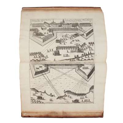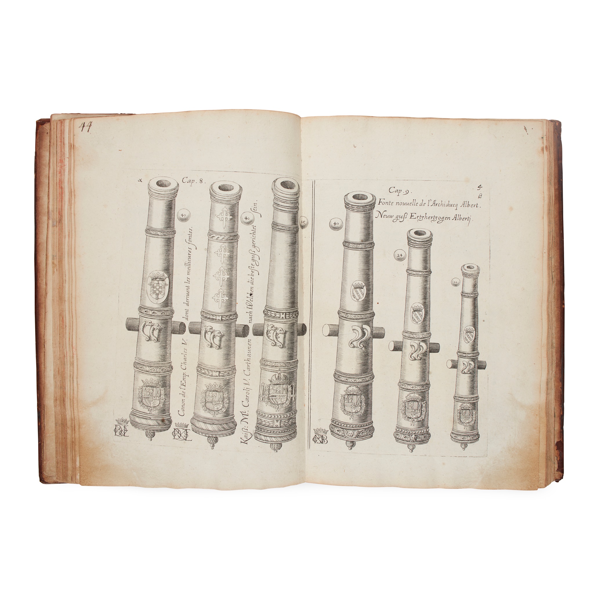 Note: An army officer and writer, Robert Norton (d. 1635) studied under John Reynolds, master gunner of England, and in 1627 was granted for life the post of engineer of the Tower of London. The plates, captioned in French and German, are printed from Theodor de Bry's plates to the 1614 edition of Ufano's Tratado della Artilleria, from which the work was adapted. ESTC traces eight copies in UK libraries; a handful of copies have appeared at auction, with varying plate counts, the folding plates often divided by binders into separate half-sheets.