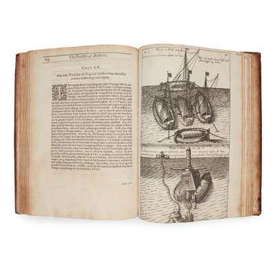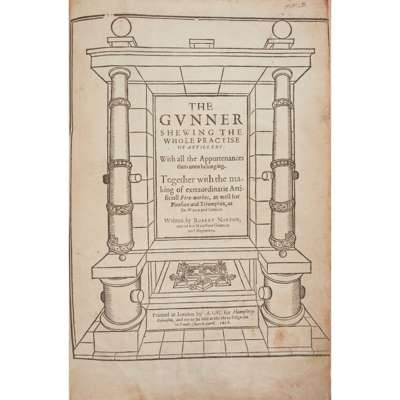 with all the Appurtnenances thereunto belonging. Together with the making of extraordinarie Artificiall Fire-workes, as for Pleasure and Triumphes, as for Warre and Service. London: by A. M. for Humphrey Robinson, 1628. Folio (28 x 18cm), contemporary mottled calf, spine relaid, label renewed, [14] 46 43-46 51-100 99-158 [2] pp., signatures A6 B2 [superscript 2]B2 C-Y4 (blanks 'A1' and 'Y4' early but probably not original), woodcut border to title, 29 engraved plates (numbered 1-11 and 13-27, 3 unnumbered, 20 folding, many closely trimmed cropping margins of image, the unnumbered plates all half-sheets, possibly comprising halves of other plates originally printed as folding sheets, and plate 12 with number cropped), diagrams in text, tear to head of spine, variable damp-staining, C3 with chip and closed tear in top margin, closed tear in L4, plate 8 (facing p. 138) with old repair [Cockle 114, calling for 'twenty-four full-page engravings'; ESTC S115254, calling for 29 plates of which 2 unnumbered and 25 folding; STC 18673]