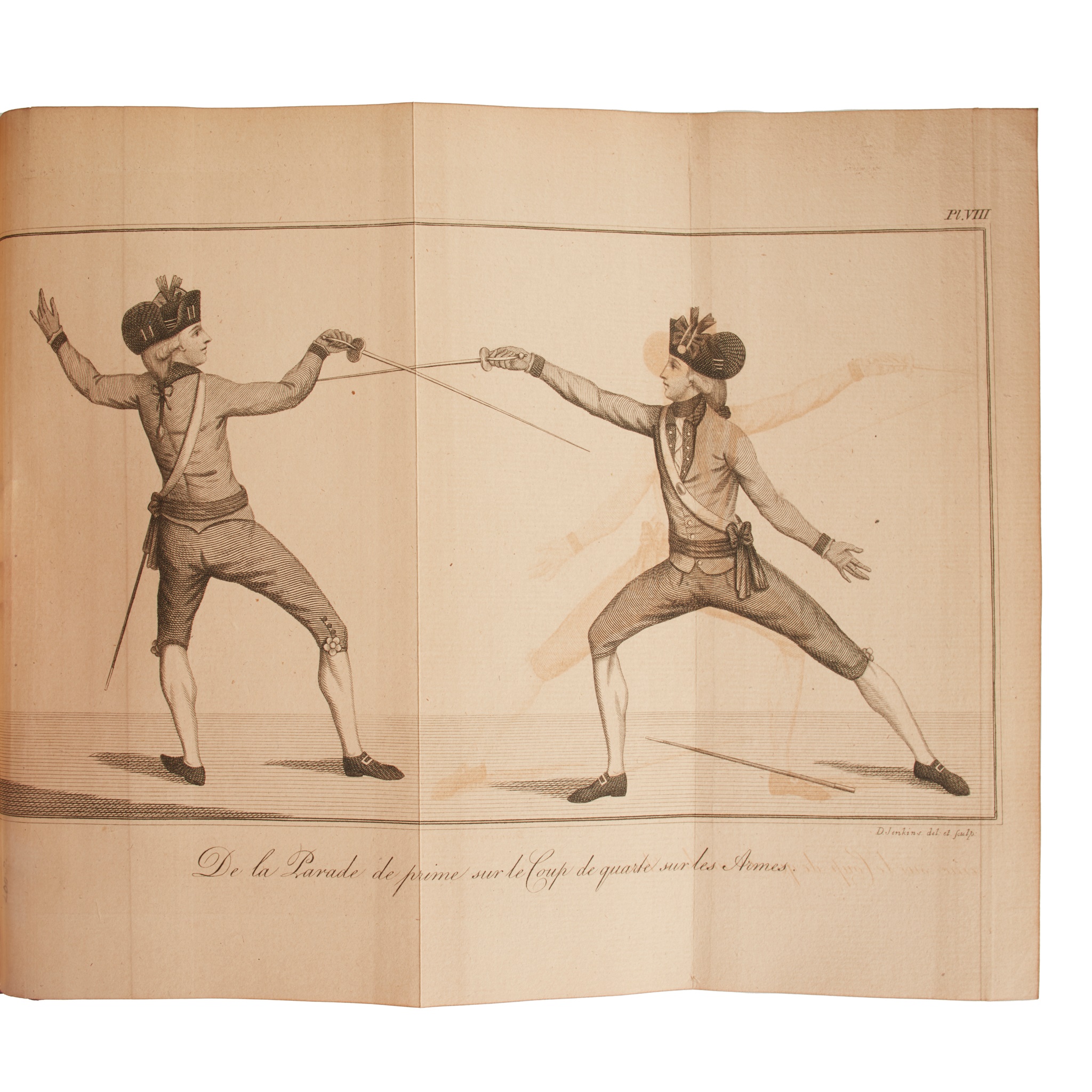 or a New Treatise on the Art of the Small Sword. London: John Bell, 1780. Second edition, 8vo (20.6 x 11.5cm), 20th-century half morocco, rebacked with original spine laid down, all edges gilt, engraved frontispiece and 13 folding plates, 2 sets of engraved arms in the text, title-pages and text in English and French, bookplate of Raymond Riling (1896-1974), author of Guns and Shooting: A Select Chronological Bibliography, plates toned and offset, plates 2-4 and 13 without numbers (possibly cropped by binder), plate 3 with split and faint adhesive residue at foot of fold [ESTC T135608, 3 copies in UK libraries; Pardoel 450; Thimm p. 128];