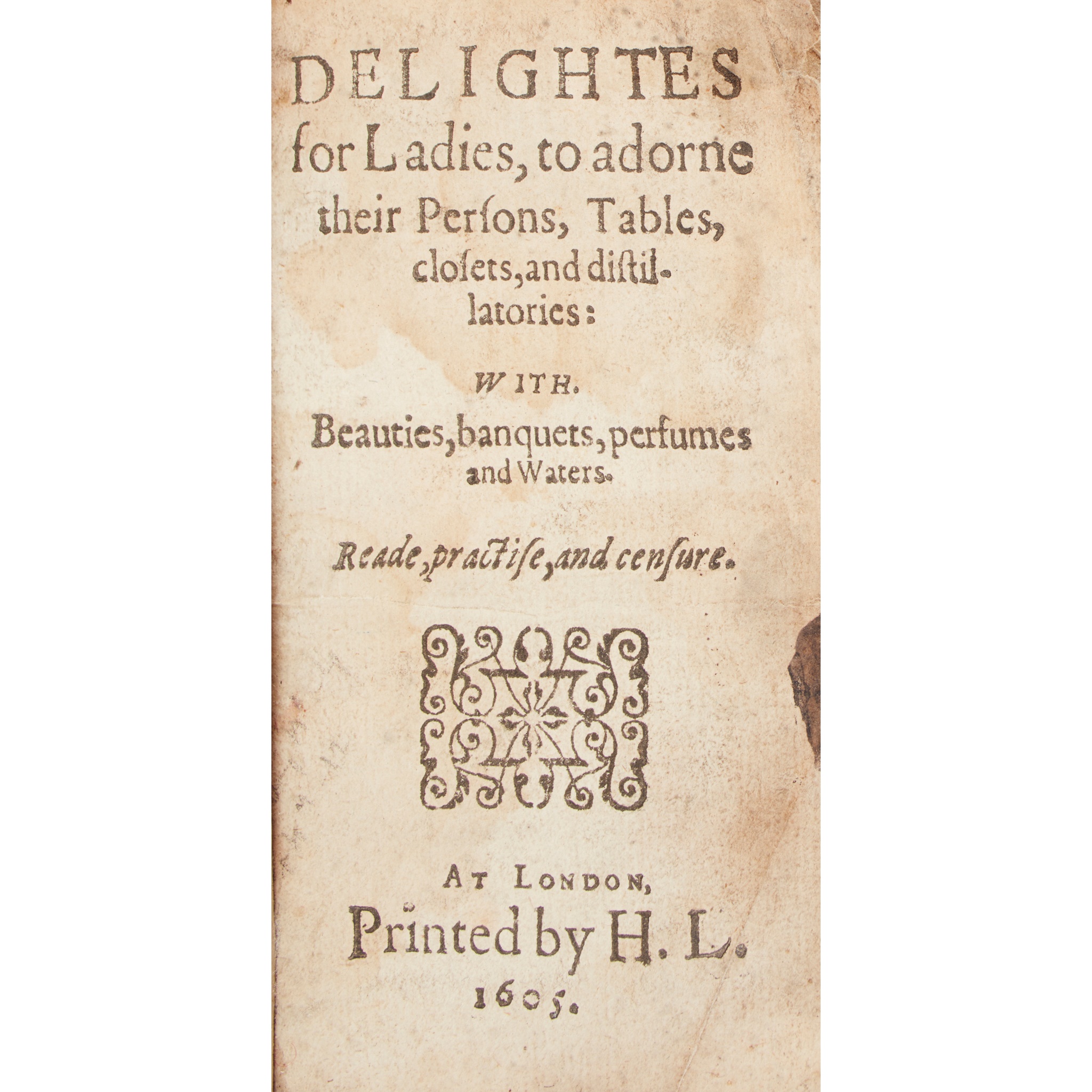 to adorne their Persons, Tables, Closets, and Distillatories: with Beauties, Banquets, Perfumes and Waters. London: printed by H. L., 1605. 12mo (12 x 6.8cm), contemporary limp vellum, unpaginated, signatures presumably A-H12 (H1-4 and H9-11 in sympathetic facsimile, also lacking H12, probably blank or cancelled, the text ending 'Finis' on H11r.), ornamental woodcut borders throughout, binding soiling, probably resewn with endpapers renewed, a large fragment from a contemporary edition of A Closet for Ladies and Gentlewomen bound in at rear, occasional damp-staining and other marks to text, worming to lower margins from quire C, E7 repaired [ESTC S94740; STC 19979.5]