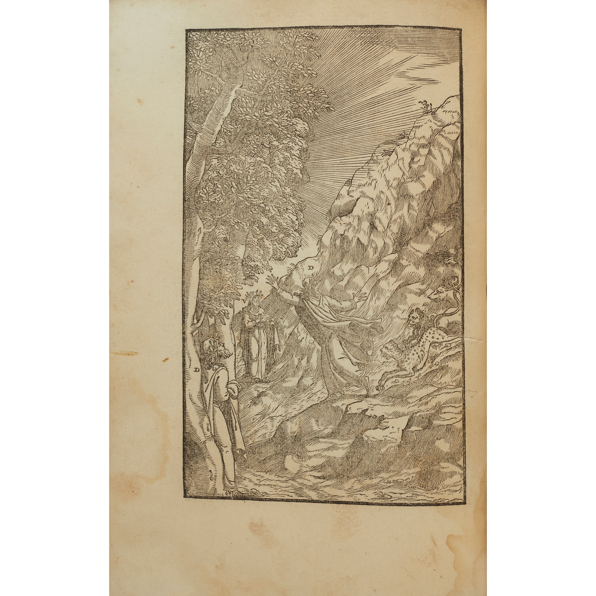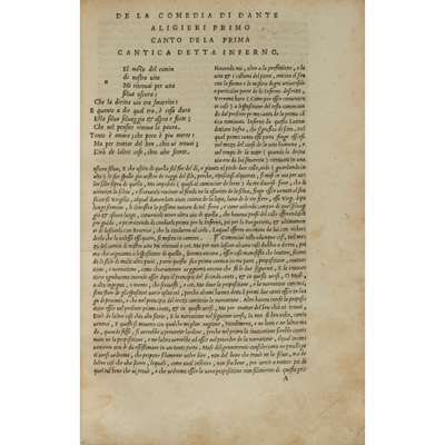 di Dante Alighieri con la nova espositione de Alessandro Vellutello. Venice: Francesco Marconi for Alessandro Vellutello, 1544. Large 8vo, 87 wood-engraved illustrations, 3 of them full-page, title partly laid down, ?17th century vellum, repairs to lower margin of AA2 and AA3 verso, dampstain to inner margin and some text at beginning, heavier dampstaining at end, a few marginal manuscript pointing fingers and a few marginal notes in an early hand, binding worn