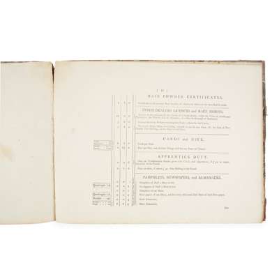 Note: A very rare item, no other copies traced. This volume lists various licenses, certificates and their costs, including the controversial ‘hair powder certificates’ costing £1.1.0. The Duty on Hair Powder Act was introduced in 1795, requiring every citizen who wished to use hair powder to buy a certificate from the stamp office costing one guinea per year. Those who wore hair powder without a certificate could be prosecuted, such as the Reverend Francis Barstow, who was fined £20 for his indiscretion.