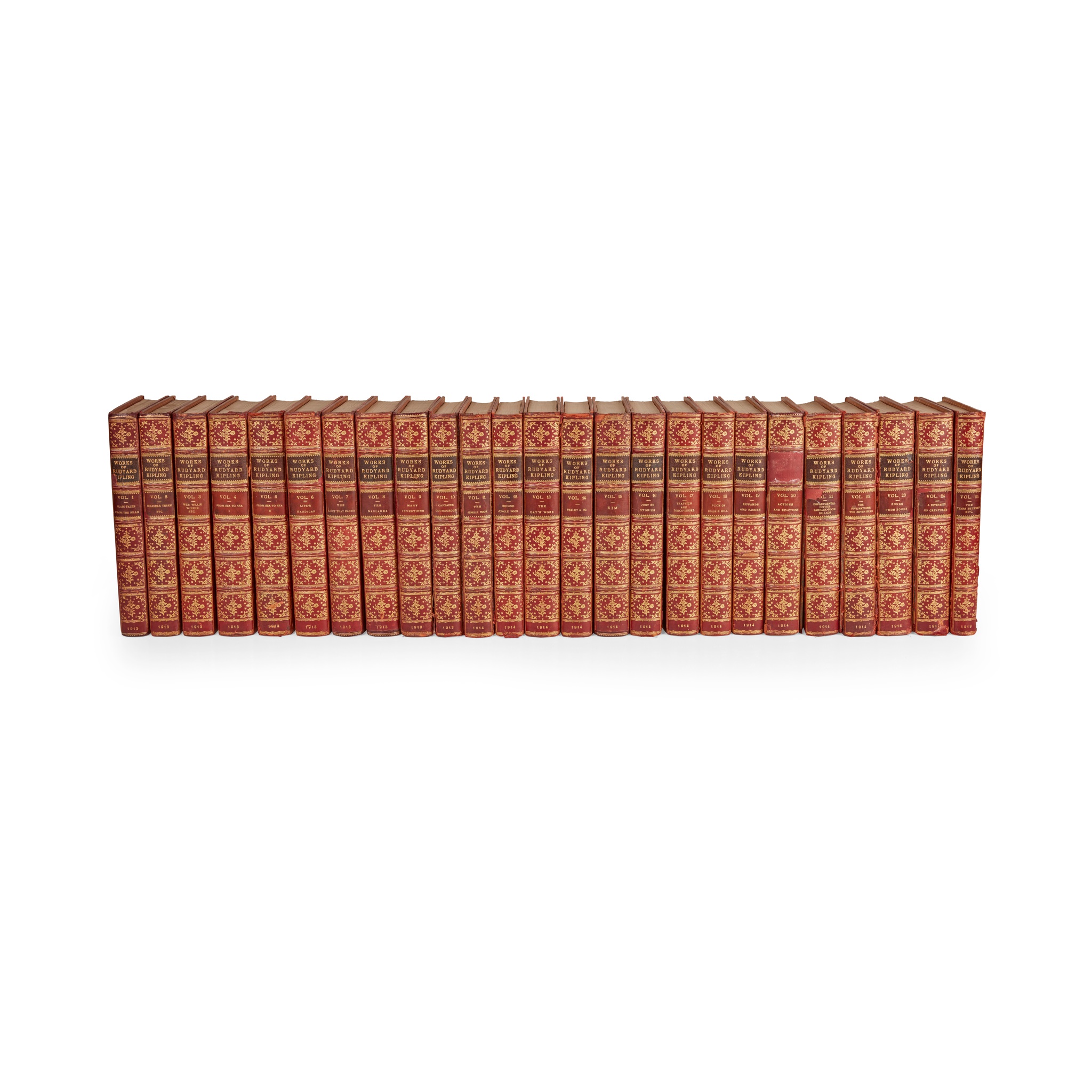 London: Macmillan and Co., Limited, 1913-1919. The Bombay Edition, one of 1050 copies, volume 1 (Plain Tales from the Hills) signed by Kipling, 25 volumes, contemporary red calf gilt, black gilt morocco labels to spines, a little rubbing to bindings, covers detached on volumes 21-24, upper cover to volume 10 reattached, volume 15 neatly rebacked, retaining original spine