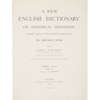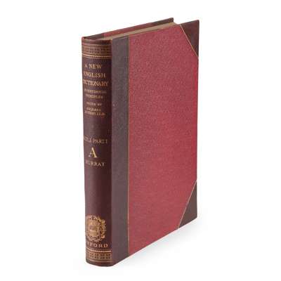 founded mainly on the Materials collected by the Philological Society. Edited by James A. H. Murray [and others]. Oxford: Clarendon Press, 1888-1933. 21 volumes, 4to (32.8 x 25.5cm), original maroon half morocco, titles and crests of the University of Oxford gilt to spines, top edges gilt, printed presentation plates to John, Lord Reith in Latin to front pastedowns [PMM 371]