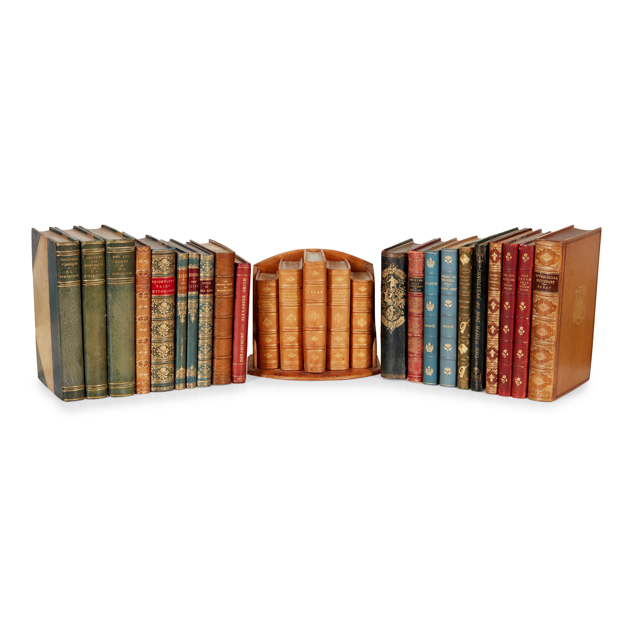 Frank Smythson Ltd. [Miniature reference library, titled on spines:] Proverbs and Maxims, Mythology; Italian & English Dictionary; Atlas; French & English Dictionary; English Dictionary. 5 volumes, 16mo and 8vo, contemporary tan calf, gilt edges, in original case, some rubbing and discolouration to leather;