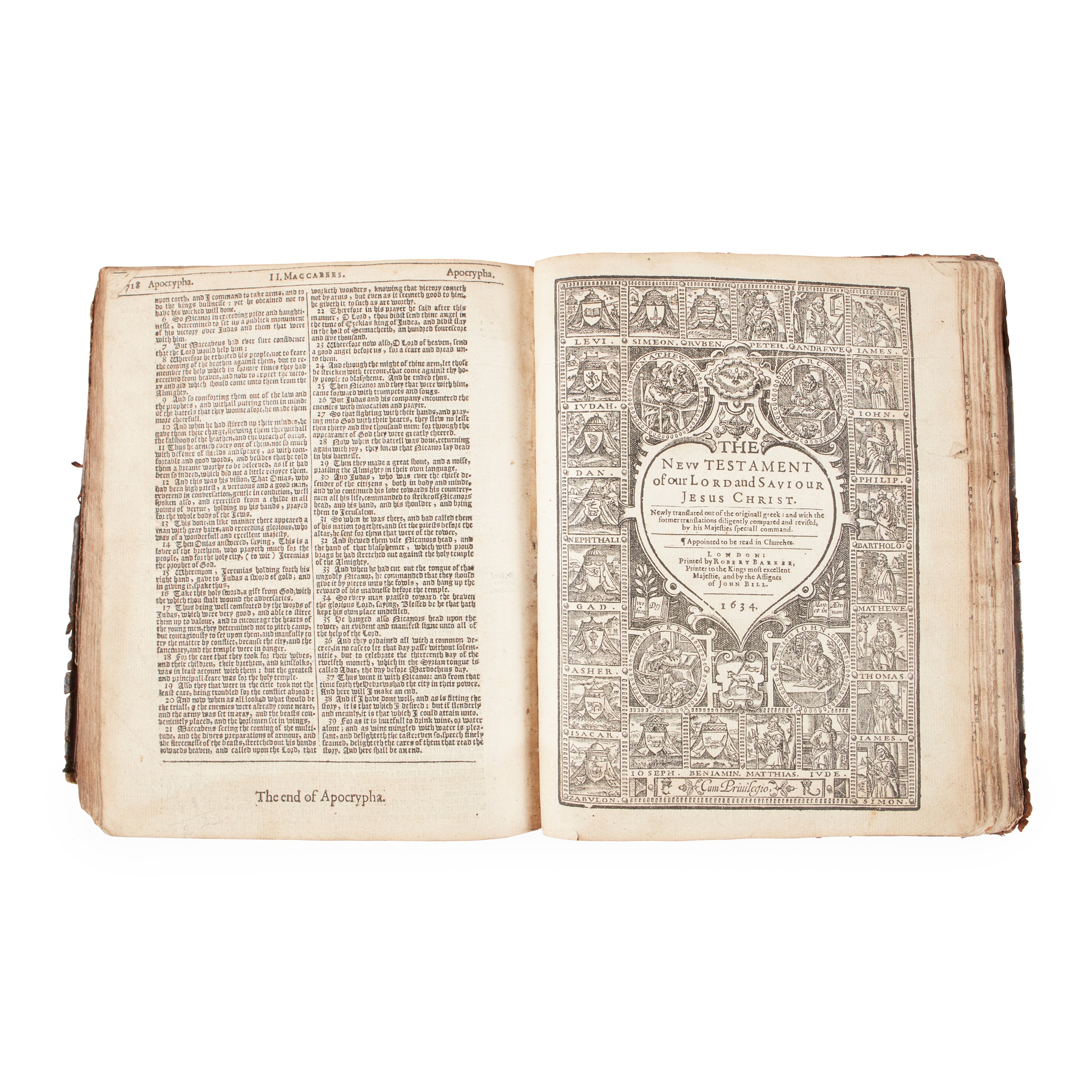 London: Robert Parker, and the Assignes of John Bill, 1634. 4to in 8s, contemporary calf, lacking A1 (general title page) and 2U8 (Apocrypha, I Maccabees 5-6), binding worn, leaves closely trimmed in places with headlines, side-notes, catchwords and signature-marks frequently shaved, main text occasionally affected (e.g. quire 2Q, Apocrypha), intermittent damp-staining to foot, occasional chips and tears especially to rear of NT, a few leaves tipped in or otherwise repaired, closed transverse tear in 2U4 closed tear, chips to lower fore corners of 3I1 and 3I5 costing a few words [Darlow & Moule 490; STC 2131b]
