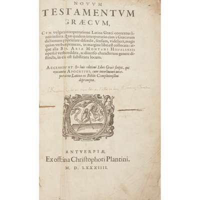 Antwerp: ex officina Christophori Plantini, 1584. 2 parts in 1 volume, folio (34.5 x 21cm), contemporary mottled calf, relaid on modern boards with endpapers renewed, Biblia Hebraica (OT) bound right to left, Novum Testamentum Graecum (NT) bound left to right, [20] 183 [1] 283 [1] 84 203, [8] 186 pp., woodcut Plantin device to both title-pages, covers scored and pitted, variable damp-staining to first 100 pages of OT, NT title-page creased, frayed and marked [Adams B972; Darlowe & Moule 4645 (NT) & 5106 (OT)]